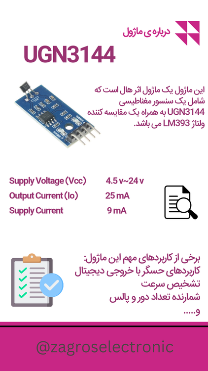 ماژول UGN3144 یک حسگر اثر هال (Hall-Effect Sensor) پیشرفته از شرکت Allegro MicroSystems است که به دلیل عملکرد بینظیر در شرایط دمایی بالا و حساسیت فوقالعادهاش، در صنایع مختلف از جمله خودروسازی، اتوماسیون صنعتی و الکترونیک مصرفی کاربرد گستردهای دارد. این حسگر با طراحی مونولیتیک و مشخصات مغناطیسی دقیق، به طور خاص برای عملکرد پایدار در دماهای بالا (تا 150+ درجه سانتیگراد) و تغییرات ولتاژ تغذیه طراحی شده است. در ادامه، به بررسی ویژگیها، کاربردها و مزایای این ماژول میپردازیم.